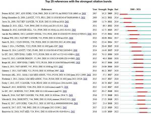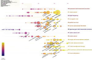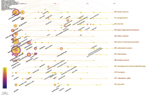 The most cited references are often considered the basis of research in the field. In the literature, we retrieved CRC and TME related studies, and the highly cited references are shown in Table 5. Sung, Hyuna’s article “Global cancer statistics 2020” (1) in CA-A Cancer Journal for Clinicians was the most frequently cited (n=755). These articles were all published in journals with high IFs, indicating that they were authoritative articles in the research field. Figure 7A presents a visual network diagram of the references. Figure 7B is a density map of the reference. References were also analyzed in a timeline view (Figure 8). Larger nodes represent the most citations, “Transanal total mesorectal excision” (Cluster 0), “oncogenic role” (Cluster 3), “cancer-associated fibroblast” (Cluster 5), “total neoadjuvant therapy” (Cluster 11) have been the research hotspots in this field since 2018. Moreover, we also conducted a reference mutation analysis, as shown in Figure 9. The first citation outbreak began in 2010, and since 2015, many citation outbreaks have occurred; thus far, many citation outbreaks are still in progress, which means that research on CRC and the TME is still a hot spot.