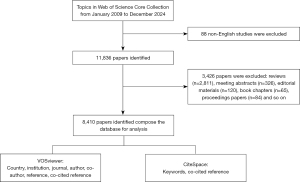 The Web of Science Core Collection (WoSCC) was used to search for literature related to CRC and the TME from 2009 to 2024. The search formula was TS=(tumor microenvironment OR TME) AND (colon or rectum or colorectal or rectal) AND (cancer* OR oncology OR tumour* OR tumor* OR carcinoma* OR neoplasm*). The search was conducted using free-text keywords and did not specifically utilize Medical Subject Headings terms. The time limit was from January 1st 2009 to December 31st 2024, the publication language was limited to English, the article type was only original, and the articles unrelated to the topic of the article were excluded. After exporting all retrieved records, duplicates were identified and removed using EndNote X9 and manual cross-checking based on title, author, year, and DOI. The study selection process involved two stages: initially, irrelevant papers were excluded based on title and abstract screening; for records where relevance was uncertain, the full text was reviewed to determine eligibility. Three researchers independently screened the titles and abstracts of all articles to exclude those unrelated to the topic. Discrepancies were resolved through discussion among the research team. Finally, author names, institution affiliations, and keywords were standardized, for example, “tumor microenvironment” and “tumor microenvironment” were merged.