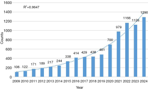 A total of 8,410 articles related to CRC and the TME were included in this study. The number of CRC and TME articles from 2009–2024 gradually increased, as shown in Figure 2. The exponential growth function was used to evaluate the correlation between the cumulative number of publications and the year of publication, and the results were consistent with the trend of the cumulative number of publications (R2=0.97647). This significant correlation indicates that research on CRC and the TME has made significant progress and development.