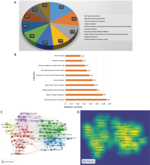 The top 10 institutions with the most publications are shown in Figure 4A. Sun Yat-sen University is the most prolific institution with 320 publications, followed by Shanghai Jiao Tong University (n=230), the Chinese Academy of Sciences (n=228), Fudan University (n=220), etc. Seventy percent of the top 10 high-yield institutions are from China, which is consistent with the country’s leading position in total publication output. Figure 4B shows the research institutions with high mediation centrality; In network theory, a mediation centrality greater than 0.1 indicates that an institution acts as a key connector or bridge within the collaborative network. These high-yield institutions also held central positions in the network structure. The mediation centralities of the Chinese Academy of Sciences, Baylor College of Medicine and Massachusetts General Hospital were 0.65, 0.59 and 0.5, respectively. These institutions not only have high literature output, but also high mediation centrality, suggesting that they played a pivotal role in both producing research and facilitating collaboration within the research network of CRC and the TME. Figure 4C,4D show the cooperative visual network of the publishing institution. Shanghai Jiao Tong University, Fudan University, Sun Yat-sen University and Zhejiang University have close cooperative relationships.