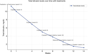 Simultaneously, the patient was initiated on corticosteroids (dexamethasone 2 mg twice daily, later transitioned to prednisone 10 mg thrice daily, and tapered gradually) to reduce hepatic inflammation and edema. Over the next few weeks, her bilirubin levels declined to 6.9 mg/dL, permitting the initiation of weekly cisplatin therapy at week 4. The patient received six weekly doses of cisplatin, leading to a notable reduction in bilirubin to 2.6 mg/dL.