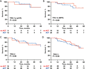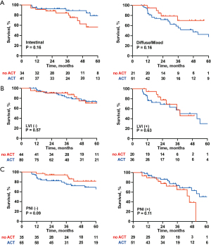 After PSM, 64 patients remained in the ACT group and 116 in the no-ACT group. As shown in Table 2, no significant differences in clinicopathological characteristics were observed between the two groups after matching.