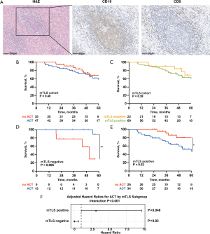 Based on the presence of mTLS in the tumor bed, patients in the mTLS cohort were classified into mTLS-positive and -negative groups. No significant difference in OS was observed between these two subgroups (P=0.38, Figure 5C). However, within the mTLS negative subgroup, patients who received ACT showed significantly better OS than those who did not (P=0.006, Figure 5D). Conversely, among mTLS positive patients, the no ACT group exhibited superior OS (P=0.02, Figure 5E).