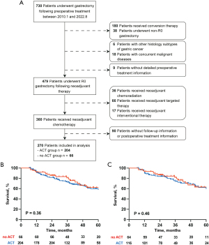 This study included 270 LAGC patients who received NACT followed by radical surgery at Zhongshan Hospital of Fudan University between January 1, 2010, and August 30, 2022. The inclusion criteria were as follows: (I) histologically confirmed gastric adenocarcinoma before initiating neoadjuvant treatment; (II) absence of distant metastasis or other unresectable factors at baseline; (III) completion of NACT followed by radical gastrectomy; and (IV) availability of clinicopathological information. The exclusion criteria were as follows: (I) patients who received neoadjuvant chemoradiation, neoadjuvant targeted therapy, or intraperitoneal chemotherapy; (II) patients who died within 1 month after the surgery; and (III) patients with other concurrent malignant tumors or other serious life-threatening diseases. According to the receipt of ACT, patients were divided into two groups: the ACT group and the no ACT group. Demographic characteristics, clinicopathological parameters, and survival information of each patient were collected retrospectively. The study was conducted in accordance with the Declaration of Helsinki and its subsequent amendments. The study was approved by the Ethical Committee of Zhongshan Hospital, Fudan University (No. B2023-229). Informed consent was obtained from all patients.