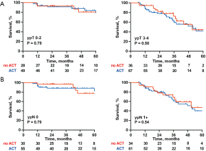 Clinicopathological features were reported as either the mean and range or as frequency and proportion, as appropriate. The differences in clinical and pathological characteristics between the two groups were analyzed using either the unpaired Student’s t-test or the chi-square test. Overall survival (OS) curves were generated using the Kaplan-Meier (KM) method, and differences in OS based on the receipt of ACT were compared using the log-rank test in the entire cohort. Subgroup analyses were also performed based on various pathological characteristics, including ypT stage, ypN stage, LVI, PNI, TRG, and infiltration of tertiary lymphoid structures. In each subgroup, the OS differences between the two groups were similarly evaluated using the KM method and the log-rank test.