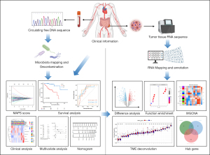 To address these gaps, we performed an integrated analysis of blood microbiome and matched transcriptomic data from The Cancer Genome Atlas (TCGA) CRC cohort. Our aims were threefold: (I) to develop and validate a blood microbiome-associated prognostic score (MAPS); (II) to determine whether integrating MAPS with key clinical factors yields a synergistic improvement in predictive accuracy over clinical-only or microbiome-only models; and (III) to preliminarily explore potential mechanisms by correlating blood microbial features with the tumor immune microenvironment. We hypothesize that this integrated approach will provide a more powerful and clinically applicable tool for prognosis prediction in CRC. We present this article in accordance with the TRIPOD reporting checklist (available at https://jgo.amegroups.com/article/view/10.21037/jgo-2025-460/rc).