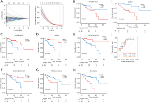 The LASSO Cox regression analysis identified seven microbes that were significantly associated with the OS of CRC patients (Figure 2A). Gelidibacter, Sulcia, Cyclobacterium, Lachnobacterium were defined as prognosis favorable microbes, while Simplexvirus, Nitrosococcus, Aureispira were defined as prognosis risk microbes (Figure 2B-2H). Then, the MAPS was derived from these microbes by the linear combination of the abundance and coefficient (table available at https://cdn.amegroups.cn/static/public/jgo-2025-460-1.xlsx). Kaplan-Meier survival curves illustrated that patients with high MAPS had significantly poorer OS compared to those with low scores (Figure 2I, log-rank P<0.001). Time-dependent ROC analysis further validated the prognostic accuracy of MAPS, with area under the curve (AUC) values of 0.759, 0.795, and 0.834 for 1-, 3-, and 5-year OS predictions, respectively (Figure 2J).