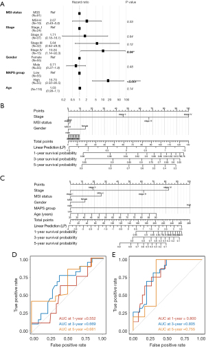 In the multivariate COX regression analyses, the MAPS score emerged as an independent predictor of OS, even after adjustment for age, gender, tumor stage, and MSI status [hazard ratio (HR) =16.79; 95% confidence interval (CI): 3.50–80.5; P<0.001]. Consistent with expectations, advanced tumor stage was also associated with poorer OS (Stage IV vs. Stage I: HR =10.24; 95% CI: 1.14–92.3; P=0.04) (Figure 3A).