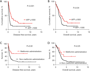 The prognosis of patients with a preoperative AFP level ≤1,000 ng/mL was significantly better than those with a preoperative AFP level >1,000 ng/mL in terms of both DFS (P<0.001; Figure 1A) and OS (P=0.04; Figure 1B). Importantly, as for individuals with a preoperative AFP level ≤1,000 ng/mL, remarkable improvement in cumulative survival proportion was observed throughout the follow-up. The 1-, 3-, and 5-year DFS of patients with a low AFP level was 43%, 33%, and 26%, respectively, whereas for patients with a high AFP level, the 1-, 3-, and 5-year DFS rates were 15%, 15%, and 15%. The 1-, 3-, and 5-year OS of patients with a low AFP level was 58%, 33%, and 24%, respectively, whereas for patients with a high AFP level, the 1-, 3-, and 5-year OS rates were 49%, 12%, and 10% (Table 2). In further analysis of the correlation between metformin administration and DFS and OS, all patients were stratified into two groups based on history of metformin administration. Significant improvement in DFS was noted among the group of metformin administration (P=0.02; Figure 1C). Although the metformin administration group showed a markedly superior OS, statistical analysis did not indicate this difference to be significant (P=0.25; Figure 1D). This may be due to the limited sample size in our study.