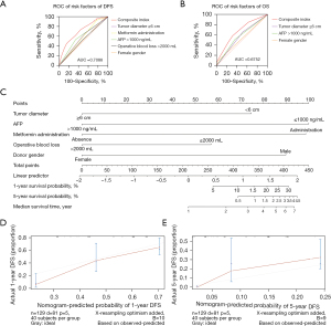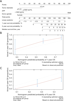As indicated in Table 3, a tumor diameter ≥6 cm, an AFP level >1,000 ng/mL, lack of metformin administration, operative blood loss, and donor gender were selected for the construction of a nomogram predicting DFS, which was evaluated with the concordance index. The concordance index is a measure of the predictive accuracy of the model being tested and ranges from 0.5 (completely random prediction) to 1 (perfect prediction). The concordance index for the nomogram developed in this study was 0.708 (Figure 2C). The actual DFS and the ideal DFS are shown as different lines in the calibration plot in Figure 2D,2E; these two lines were closely aligned, demonstrating good calibration. A tumor diameter ≥6 cm, an AFP level >1,000 ng/mL, and female donor gender were included in the nomogram for predicting OS (Figure 3A). Its concordance index was 0.637, with moderate calibration in 1-year survival (Figure 3B) and 5-year survival (Figure 3C).