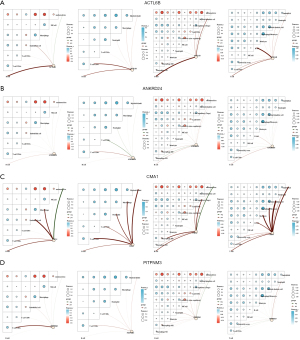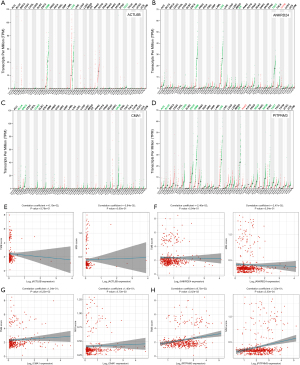Additionally, the TMB and MSI scores were analyzed. The expression levels of ACTL6B and ANKRD24 were negatively correlated with colorectal cancer, though without statistical significance, while CMA1 and PITPNM3 were positively correlated, with PITPNM3 showing statistical significance (P<0.001) (Figure 2E-2H).