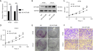 Bioinformatic screening identified ACTL6B as the top candidate among the four bevacizumab-response genes. HT29 and COLO cells were therefore transduced with lentiviral particles carrying human ACTL6B-coding sequences. RT-qPCR and immunoblotting confirmed robust elevation of both transcript and protein (Figure 6A,6B). Functional assays revealed that enforced ACTL6B expression markedly curtailed viability and clonogenic output in both lines (MTT and colony formation; Figure 6C-6E). Transwell migration tests further showed that metastatic capacity was significantly blunted after ACTL6B up-regulation (Figure 6F).