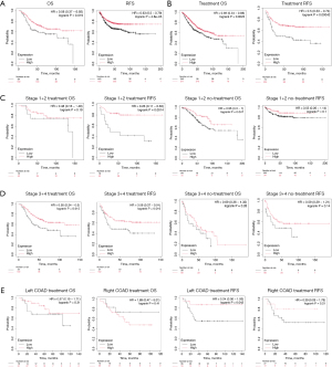 For patients in clinical stages 1-2, adjuvant chemotherapy significantly improved OS compared to those without chemotherapy (HR: 0.48 vs. 0.55) and notably reduced recurrence risk (HR 0.26 vs. 0.55) (Figure 8C). For stages 3-4, patients receiving adjuvant chemotherapy showed significantly lower OS and RFS risks compared to those without treatment (HR: OS, 0.55 vs. 0.69; RFS, 0.58 vs. 0.59), with significant differences in the treatment group (P=0.02) (Figure 8D). Finally, in terms of tumor location stratification, patients with left-sided colorectal cancer receiving adjuvant chemotherapy had significantly better OS and RFS than those with right-sided colorectal cancer (HR: OS, 0.57 vs. 1.69; RFS, 0.24 vs. 0.39) (Figure 8E).