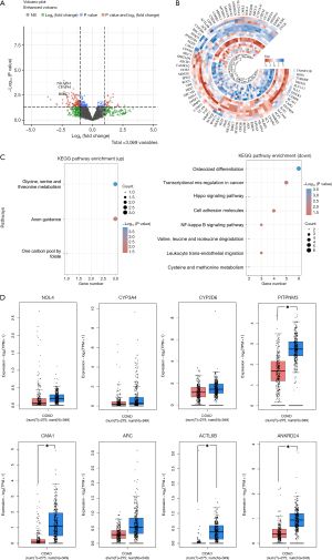 To investigate the biological mechanisms underlying bevacizumab treatment in colorectal cancer patients, we conducted a differential gene expression analysis using transcriptomic data from two groups of patients in the TCGA database: those who responded to Bevacizumab and those whose disease remained stable or progressed. As shown in the volcano plot and differential expression heatmap (Figure 1A,1B), a total of 28 genes were significantly upregulated, while 51 genes were significantly downregulated. GO and KEGG pathway enrichment analyses of these genes, illustrated in Figure 1C, revealed that upregulated genes were primarily involved in metabolism-related pathways, whereas downregulated genes were enriched in pathways related to transcriptional regulation and cell adhesion. Based on the hypothesis that genes upregulated post-treatment may serve as potential therapeutic response targets and that their expression levels may have been lower prior to treatment, we further analyzed the pre-treatment expression levels of these upregulated genes. Ultimately, eight potential bevacizumab response genes were identified: NOL4, CYP3A4, CYP2D6, PITPNM3, CMA1, ARC, ACTL6B, and ANKRD24 (Figure 1D).