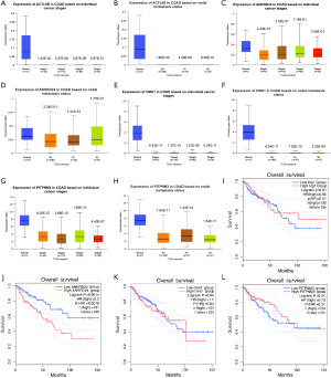 We first queried the UALCAN portal to compare mRNA levels of ACTL6B, ANKRD24, CMA1 and PITPNM3 between tumour and adjacent normal tissues, and to inspect their distribution across lymph-node status and tumour stage. Figure 3 shows that all four transcripts were markedly down-regulated in primary tumors relative to normal mucosa. Peak expression was observed in stage-III tumors, whereas among nodal categories ANKRD24 was highest in N2 and PITPNM3 in N1 (P=0.02, Figure 3A-3H).