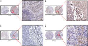 We further evaluated the expression of ACTL6B, ANKRD24, CMA1 and PITPNM3 at the protein level. Consistent with the RNA-level findings, the expression levels of four proteins were significantly lower in tumor tissues compared to normal tissues through the immunohistochemical method in colorectal cancer and normal intestinal epithelium using the Human Protein Atlas database (Figure 4).
