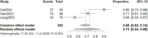 | 10-month OS | 3 | 139 | 203 | 0.73 (0.54–0.86) | 9.94 | 0.58 | 81.60 |