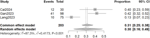Four studies involving 238 HCC patients reported the 10-month PFS rate (7,8,10,11). As presented in Figure 4 and Table 2, the pooled rate was 0.41 (95% CI: 0.30–0.54). Heterogeneity was also noted (I2 =78.3%, P<0.10).