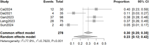 Regarding TRAEs ≥ grade 3, five trials with 278 HCC cases were involved (7,8,10-12). As exhibited in Figure 7 and Table 2, the cumulative incidence was 0.23 (95% CI: 0.12–0.42), demonstrating heterogeneity (I2 =77.9%, P<0.10). The most common TRAEs ≥ grade 3 included hypertension (12.80%), abnormal liver function (3.57%), decreased neutrophil count (2.38%), and decreased platelet count (3.27%) (Table 3).