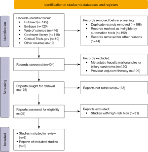 Figure 1 shows that this search yielded a total of 838 studies initially considered for review (13). Studies that were excluded are listed below: 109 studies due to previous adjuvant therapy, 120 studies focusing on metastatic hepatic malignancy or intrahepatic bile duct carcinoma, 198 duplicate studies, 44 trial protocols, 192 articles consisting of reviews and case reports, 67 studies lacking ORR or DCR data, 71 studies involving cells or animals, and 31 high-bias studies. Consequently, a total of 6 high-quality, low-bias trials were enrolled in this meta-analysis.