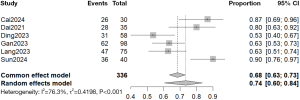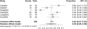 In terms of ORR and DCR, six studies with 336 HCC cases were included (7-12). The combined ORR and DCR were 39% (95% CI: 26–55%) and 74% (95% CI: 60–84%), respectively (Figures 2-3 and Table 2). As manifested in Table 2, both had heterogeneity (ORR, I2 =83.7%; DCR, I2 =76.4%; both P<0.10).