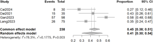 Stata software (version 14) and R software with the metaprop packages were used to generate the combined rate with 95% confidence intervals (CIs). Heterogeneity exists when I2 >50% and P<0.10. In this context, a sensitivity analysis was performed to examine the robustness and stability of the meta-analysis results, as well as to identify potential sources of heterogeneity. If potential sources of heterogeneity cannot be found, the aggregated rate was computed using a random-effects model. Publication bias was tested using funnel plots and Egger’s test (15). There was publication bias when the P value was less than 0.05 in Egger’s test and asymmetry was observed in the funnel plots.
