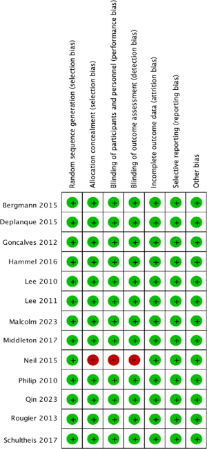 The quality of the included RCTs was assessed using the Cochrane Risk of Bias Tool. Of the studies, 12 demonstrated a low risk of bias across all domains, including randomization, allocation concealment, blinding of participants and personnel, and outcome assessment (7,16-20,22-27). One study raised “some concerns” due to the incomplete reporting of blinding procedures (Figures 2,3). Egger’s regression test yielded a P value of 0.59, indicating no evidence of publication bias.