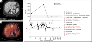 Two weeks post surgery, the patient’s serum Ca again increased to 2.75 mmol/L and her prednisolone was increased to 40 mg daily. A week later, her Ca decreased to 2.51 mmol/L and 1,25(OH)2D normalized to 162 pmol/L. Due to concerns about recurrence of hypercalcemia before her final liver resection, and to assess whether a non-bisphosphonate agent might be more effective given her limited and short-lived response to prior bisphosphonate therapy, she received a single 120 mg subcutaneous dose of denosumab. However, her Ca levels remained unchanged, ranging between 2.51 and 2.58 mmol/L, pre and post denosumab.