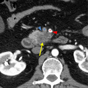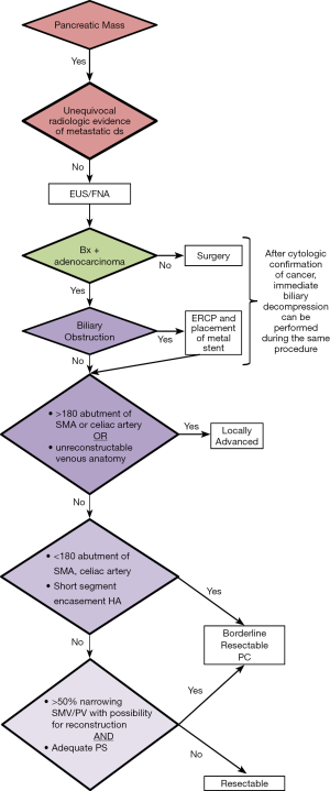 Our preferred algorithm for the initial diagnostic work-up and management of suspected PC is summarized in Figure 4. The single most important imaging tool for the detection and staging of PC is a CT scan. Current multi-detector protocols utilize dual-phase technique, with the acquisition of arterial phase images at 30 seconds after IV injection of contrast and portal venous images approximately 1 minute after injection. A rapid injection of intravenous contrast allows for the maximal enhancement of the pancreas and mesenteric vasculature (10). At least two phases of contrast-enhanced helical scanning are required. The first (arterial) phase is performed from the diaphragm through the horizontal portion of the duodenum in order to define the relationship of the tumor to the adjacent arteries and to determine the presence or absence of aberrant arterial anatomy. The arterial phase images are used for visualization of the primary tumor and optimal assessment of the tumor-artery relationships. Arterial phase images allow low-density adenocarcinomas to be distinguished from pancreatic neuroendocrine tumors, which are classically hypervascular in the arterial phase. The second (venous) phase is performed to define the relationship of the tumor to the surrounding venous structures (SMV, portal vein, and splenic vein) and to uncover metastases to locoregional lymph nodes and distant organs (particularly to the liver). Multidetector contrast enhanced CT provides the most comprehensive evaluation for clinical staging; we reserve additional imaging studies such as magnetic resonance imaging or positron emission testing for indeterminate lesions which are suspicious for metastatic disease.