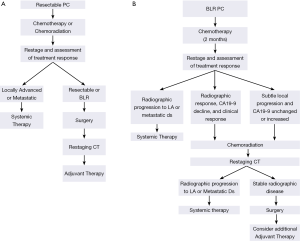 Our preferred off-protocol neoadjuvant treatment schema for patients with BLR PC consists of an initial two months of systemic therapy followed by chemoradiation (Figure 5B). The choice of systemic agents for initial treatment has evolved from gemcitabine-based therapies to consideration of FOLFIRINOX, GTX, gemcitabine/nab-paclitaxel, or other combination therapies (26,39,47-50). After the delivery of systemic therapy, patients are restaged with particular attention to treatment response indicators (clinical, radiographic, biochemical). Importantly, in the absence of a robust response to chemotherapy alone (and assuming no evidence of distant disease), it is our practice to proceed directly to chemoradiation (as discussed above) to minimize the risk of local disease progression after chemotherapy. Treatment sequencing in patients with BLR PC aims to both treat presumed (radiographically occult) systemic disease without the delay imposed by a surgery-first treatment approach—while also avoiding local disease progression which may sacrifice a window of opportunity for surgical resection of the primary tumor. Patients who have stable disease following two months of chemotherapy [no change on CT imaging and a modest decline (or no decline) in CA19-9] should transition to chemoradiation rather than second line systemic therapy which may increase the risk for local disease progression. As therapies evolve and therapeutic options increase, this recommendation may change. Importantly, we may be entering a new era in the management of localized PC, where small but clinically significant advances in systemic therapies improve control of distant metastases and patient survivals to the extent that more patients survive long enough to experience challenging symptoms of local-regional disease recurrence/progression for which we have little contemporary experience. The importance of local disease control, especially in patients with potentially operable disease, cannot be overstated—as clinically significant local-regional disease recurrence may be preventable with an optimal operation and the consistent delivery of multimodality therapy to include chemoradiation either before or after surgery.