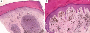 On physical examination we found a small submillimeter lesion between the fourth and fifth toes, associated with ipsilateral inguinal lymph node measuring 40 mm × 35 mm. Biopsy of these lesions confirmed diagnosis of melanoma with many sites of involution (Figure 1).