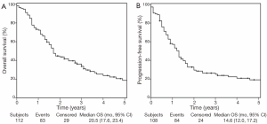 Figure 1 shows the OS and PFS Kaplan Meier curves for the patients included in this analysis. The median, 3 and 5 year OS was 20.5 months, 36%, and 19% respectively (Figure 1A). The median, 3 and 5 year PFS was 14.6 months, 24%, and 17% respectively (Figure 1B).