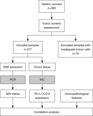Here, we aimed to study the prevalence of MSI status and CD8/PD-L1 expression in Chinese patients with GC and to evaluate the relationship between MSI status and CD8/PD-L1 expression, to provide further information for PD-L1 immunotherapy in clinical settings. We present the following article in accordance with the REMARK reporting checklist (available at https://dx.doi.org/10.21037/jgo-21-695).