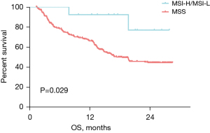 In this cohort, 3.4% of patients were MSI-H/L, and 2.1% were MSI-H. The occurrence of MSI in females (6.7%, 7/104) was significantly higher than that in males (2.2%, 6/273) (P=0.031). The occurrence of MSI in patients aged from 59 to 69 (6.1%, 9/147) was markedly higher than in other age groups (1.7%, 4/230) (P=0.023). The occurrence of MSI in patients with smaller tumors (T stage I–II, 7.8%, 4/51) was higher than that in patients with larger tumors (T stage III–IV, 2.8%, 9/326), but no significant difference was observed (P=0.064). And the occurrence of MSI in lower clinical stages (I–II, 6.5%, 7/107) was significantly higher than that in higher clinical stages (III–IV, 2.2%, 6/270) (P=0.038). However, no difference was observed between patients with lymph node metastasis (2.6%, 3/115) and GC patients without lymph node metastasis (3.8%, 10/262). The occurrence of MSI in patients with distant metastasis (6.7%, 1/15) was higher than those without metastasis (3.3%, 12/362), but there was no significant difference. MSI was not found in patients with high degrees of differentiation, and there was no significant difference between the various degrees of differentiation. Additionally, there was no difference in MSI occurrence among the different Lauren subtypes. Kaplan-Meier survival curves were generated according to the MSI status. The median overall survival (OS) of patients with MSI-H/MSI-L and MSS were 17.60 and 12.86 months, respectively. As shown in Figure 2, patients with MSI-H/MSI-L had a significantly longer OS compared with patients with MSS (P=0.029).