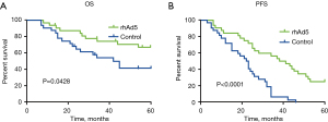 In the rhAd5 group, there were 11 cases (34.38%) of intrahepatic recurrence, one case (3.12%) of brain metastasis, and ten cases (31.25%) of lung metastasis. At the follow- up date, a total of 12 participants (37.50%) died. The average OS of the rhAd5 group and control group were 46.04±18.11 and 34.84±19.27 months, respectively. The average PFS of the rhAd5 group and control group were 37.19±18.57 and 21.43±11.14 months, respectively. The average OS and PFS of the rhAd5 group were longer than those of the control group (t=2.419, P=0.022; t=4.330, P<0.001, respectively). The OS and PFS rates of the rhAd5 group were significantly higher than those of the control group (Figure 2A,2B).