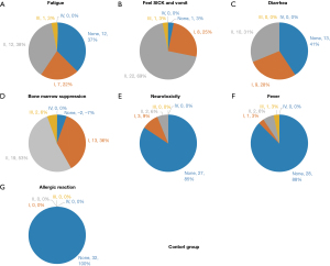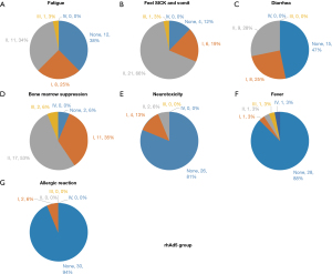 There was no liver, kidney, or cardiotoxicity above grade 3 in both groups. The most common complications were fatigue, nausea and vomiting, diarrhea, and bone marrow suppression. There was no significant difference in the incidence of adverse reactions between the control group and rhAd5 group (P>0.05). The symptoms were mild and no additional treatment was needed. The detail results were shown in Figures 3,4.