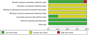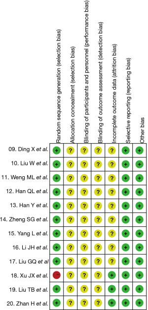 The risk of bias assessment module of RevMan 5.4 software (The Cochrane Collaboration, Copenhagen, Denmark, 2020) was used to assess the 3 evaluation indicators: (I) random allocation method; (II) blind method; (III) implementation of allocation concealment; (IV) data integrity; (V) selective reporting bias; (VI) other biases, including “low risk”, “unclear”, and “high risk”.