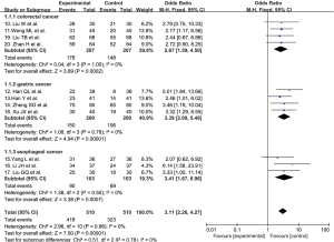 With the exception of article (9), all studies reported the effect of CKI on patients with digestive tract cancer undergoing chemotherapy. A total of 510 patients were included in the experimental group and the control group, without statistical heterogeneity between the studies (I2=0%, P=0.98). The fixed effects model analysis was used to obtain the pooled size (OR =3.11; 95% CI: 2.26 to 4.27), which indicated that the application of CKI as an adjuvant to digestive tract cancer chemotherapy can improve the efficacy (Z=7.00; P<0.00001). The patients were further divided into a colorectal cancer subgroup (OR =2.67; 95% CI: 1.59 to 4.50), gastric cancer subgroup (OR =3.39; 95% CI: 2.09 to 5.49), and esophageal cancer subgroup (OR =3.41; 95% CI: 1.67 to 6.96) according to cancer type. There was no statistical heterogeneity among the three internal subgroups (Figure 4).