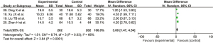 Four studies (9,18-20) reported the median survival time (months) of CKI on patients with digestive tract cancer undergoing chemotherapy. A total of 202 patients were included in the experimental group and the control group respectively, with statistically significant heterogeneity between the studies (I2=66%, P=0.03). The random effects model analysis was used to obtain the pooled size (OR =3.00; 95% CI: 1.47 to 4.52), which indicated that the application of CKI as an adjuvant to digestive tract cancer chemotherapy can improve the median survival time (Z=3.84; P=0.0001) (Figure 5).