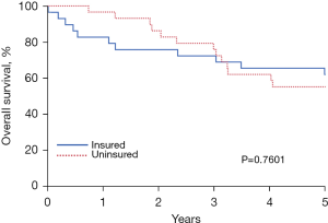 SAS and JMP software were utilized for statistical analysis (SAS Institute, Cary, NC, USA). The Kaplan-Meier product limit method provided estimates of overall survival. The log-rank test statistic assessed the level of statistical significance between strata of selected prognostic factors. Given the relatively small sample size for this series, we did not perform any type of multiple regression with insurance status in the simultaneous presence of other selected prognostic factors. A P value <0.05 was considered statistically significant.