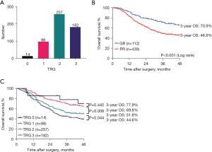 The Kaplan-Meier method was used to plot the survival curves of the 551 GC patients included in this study (Figure 1B,1C), which revealed a statistically significant difference in the prognosis between the GR and PR groups (log-rank P<0.001). The GR group had a better prognosis, with a 3-year OS of 70.9% versus 48.8% in the PR group. Furthermore, we found that there was a significant difference in the 3-year OS between patients in TRG 1 and TRG 2 (69.8% vs. 51.8%, P=0.008), while patients in TRG 2 had a better 3-year OS than patients in TRG 3 (51.8% vs. 44.6%, P=0.044). However, there was no significant in the 3-year OS between patients in TRG 0 and in TRG 1 (77.9% vs. 69.8%, P=0.445).