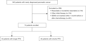 Of the 843 patients with pancreatic cancer, 769 were excluded for the following reasons: 144 had resectable or borderline resectable pancreatic cancer, 134 received initial therapy regimen other than FOLFIRINOX or GnP, and 491 did not undergo SEMS insertion within 1 month before or after chemotherapy. Finally, 74 patients who met the study inclusion criteria were enrolled in this study (Figure 1). This study was conducted in accordance with the Declaration of Helsinki (as revised in 2013). This retrospective study was reviewed and approved by the Institutional Review Board of Seoul National University Bundang Hospital and Seoul Metropolitan Government-Seoul National University Boramae Medical Center (IRB Nos. B-2104/677-104 and 30-2021-107) and the requirement of informed consent from patients was waived because of the retrospective nature of the study.