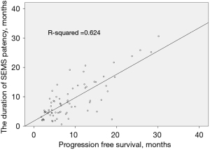 The factors associated with SEMS patency were identified using Cox regression analysis with backward elimination. Data with a P value of <0.05 in univariate analysis were included in the multivariate analysis. The Kaplan-Meier method was used to compare the duration of SEMS patency. Categorical variables were evaluated using Fisher’s exact test. The coefficient of determination (R-squared value) was used to determine the correlation between the duration of stent patency and PFS. R-squared to 1 implies a perfect relationship between the data and the model (13). The R-squared values of <0.3, 0.3–0.5, 0.5–0.7, and >0.7 indicated none or feeble, weak or low, moderate, and strong effect sizes, respectively (14). All statistical analyses were performed using the SPSS software (version 19.0; IBM SPSS Statistics for Windows, IBM Corp., Armonk, NY, USA).
