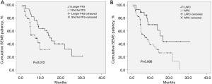 The association between SEMS patency and PFS was evaluated using scatter plots (Figure 2). The coefficient of determination between SEMS patency and PFS was 0.624 (moderate effect size). When SEMS patency was compared between the longer and shorter PFS groups (Figure 3A), the median SEMS patency of the longer PFS group was found to be significantly longer than that of the shorter PFS group (14.3 vs. 7.0 months; P=0.012). When SEMS patency was compared between patients with LAPC and those with MPC (Figure 3B), the median SEMS patency of the LAPC group was significantly longer than that of the MPC group (16.7 vs. 7.0 months; P=0.006).