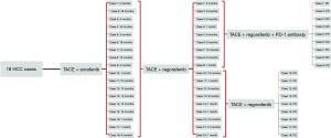 The treatment process of all patients is shown in Figure 1. Cases 1 to 9 constituted one group who received TACE combined with regorafenib and sintilimab, while cases 10 to 18 were in a second group who received TACE combined with regorafenib. A total of 18 patients with advanced HCC showed tumor progression after treatment with sorafenib and sequential regorafenib in 2021, of which nine were treated with TACE combined with regorafenib and PD-1 antibody, and the other nine continued to receive TACE combined with regorafenib. Baseline characteristics between the two groups were not significantly different (Table 1), and there was no significant difference in various factors between the two groups.