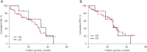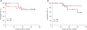 Fifty-three of 60 patients with DA underwent PD surgery with the rest 7 patients underwent LR surgery. OS at 1- and 3-year of DA patient underwent PD surgery were 73.2% and 57.2%, and median OS was 25.7±2.4 months. PFS at 1- and 3-year of patient underwent PD surgery were 77.5% and 26.5%, and median PFS was 26.8±2.5 months. The OS and PFS between the two groups did not have statistically significant difference (OS, P=0.732; PFS, P=0.777) (Figure 1). OS at 1- and 3-year of d-GIST patient underwent PD surgery were 84.6% and 74%, and median OS was 53.3±7.4 months. PFS at 1- and 3-year of patient underwent PD surgery were 100% and 87.5%, and median PFS was 62.5±2.5 months. The OS and PFS between the two groups did not have statistically significant difference (OS, P=0.614; PFS, P=0.413) (Figure 2).