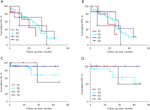 However, for patients with d-GIST, neither of pancreas invasion, the tumor location, complication, the infiltration depth, distance from the mesangial side of tumor to duodenal papilla showed significantly difference (OS, P=0.850, P=0.198, P=0.507, P=0.181, P=0.649; PFS, P=0.430, P=0.740, P=0.381, P=0.499, P=0.411) (Figures 3,4).