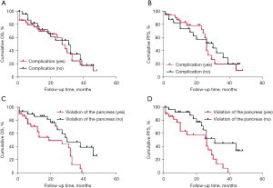 Long-term complication, survival and disease progression after operation was assessed by calling to patients or family members as well as outpatient review. Overall survival (OS) was defined as the time from surgery to the end of follow-up or death from any cause. Progression-free survival (PFS) was defined as the time from surgery to the end of follow-up or disease progression from any cause.