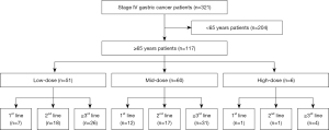 Gastric cancer (GC) is one of the most common malignancies worldwide. It is the fourth leading cause of cancer-related death, with close to 40% of new worldwide GC cases occurring in China annually (1,2). GC is typically a disease of the elderly. Most patients are diagnosed at a median age of ≥65 years. However, most guidance related to the management of GC is based on trials undertaken in the fit, younger patients at present because the subgroup of elderly patients is mostly underrepresented in clinical trials due to the poor organ functions and other underlying diseases. Hence, this subgroup, and data supporting treatment for elderly patients with metastatic gastric cancer (mGC) is scarce.
