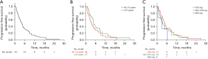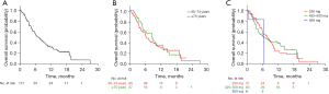 At the time of data cutoff, the median PFS was 4.27 months (95% CI: 3.24 to 5.29 months) in the whole group (Figure 2A). The median PFS rates in the patients aged 65–74 years and patients aged ≥75 years were 3.53 months (95% CI: 2.38 to 4.69 months) and 4.80 months (95% CI: 3.54 to 6.06 months), respectively, and there was no significant difference in PFS between patients aged 65–74 years and those aged ≥75 years (χ2=3.378, P=0.066) (Figure 2B). The median PFS rates were 4.87 months (95% CI: 3.64 to 6.10 months), 3.53 months (95% CI: 1.77 to 5.30 months), and 3.03 months (95% CI: 0.00 to 6.87 months) in the low-dose, mid-dose, and high-dose groups, respectively (Figure 2C). The median OS (mOS) was 7.13 months (95% CI: 5.04 to 9.22 months) in the whole patients (Figure 3A). The mOS rates in the patients aged 65–74 years and patients aged ≥75 years were 6.33 months (95% CI: 4.85 to 7.82 months) and 8.40 months (95% CI: 5.42 to 11.38 months), respectively, and there was also no significant difference in OS between patients aged 65–74 years and those aged ≥75 years (χ2=1.406, P=0.306) (Figure 3B).The mOS rates were 7.93 months (95% CI: 4.98 to 10.88 months), 6.33 months (95% CI: 2.77 to 9.90 months), and 6.47 months (95% CI: 0.00 to 14.82 months) in the low-dose, mid-dose, and high-dose groups, respectively (Figure 3C). The PFS and OS in the low-dose group were longer than those in the mid-dose and high-dose groups, but there were no significant differences in PFS and OS among the 3 dose groups (χ2=1.919, P=0.383; χ2=0.426, P=0.808, respectively).